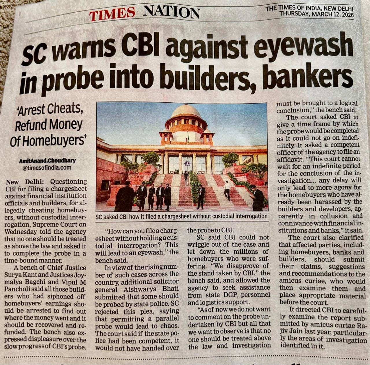 राजेश मिश्रा: डेवलपर्स और बैंकों के अपवित्र गठजोड़ द्वारा घर खरीदारों से ठगी के मामले में सीबीआई द्वारा दाखिल चार्जशीट पर सुनवाई करते हुए बुधवार को सुप्रीम कोर्ट ने नाराजगी जताते हुए कहा कि आरोपितों की कस्टडोयल इंटेरोगेशन क्यों नहीं की गई? सुप्रीम कोर्ट की ये फटकार मथुरा के एक बिल्डर के लिए मुसीबत बन सकती है। क्योंकि इस मामले में ये बिल्डर भी आरोपित है।